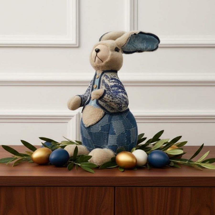 Coelho decorativo premium com roupa bordada jeans azul, moderno e elegante, ideal para composições de Páscoa, no tamanho 36x23x19cm.