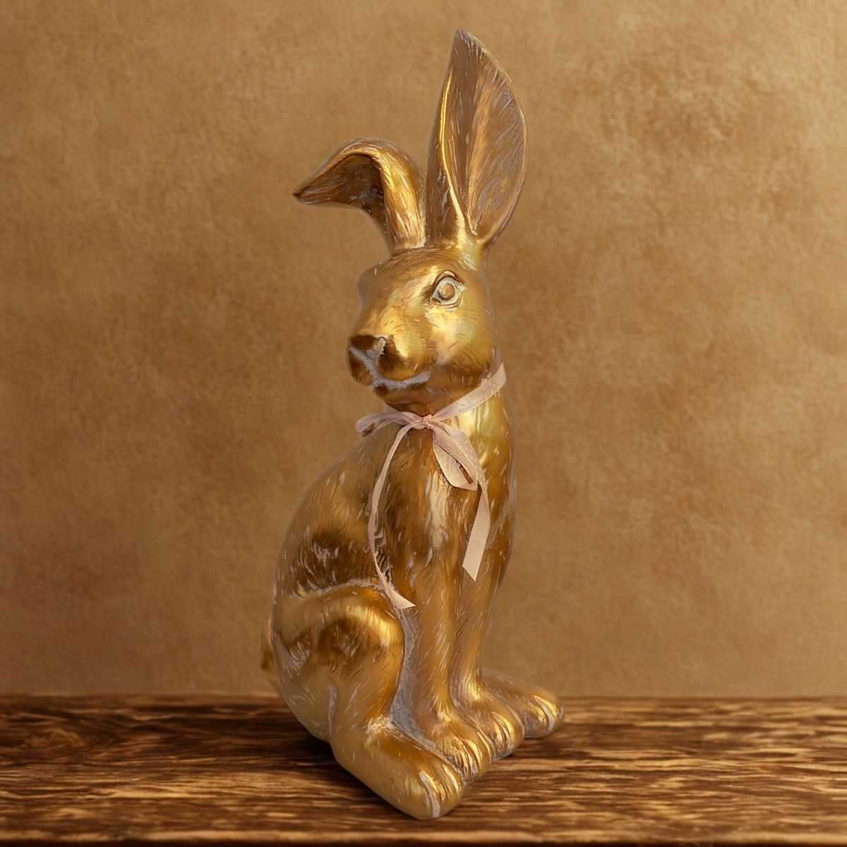 Coloque o enfeite sobre mesas, prateleiras ou aparadores, sozinho ou em conjunto com outros itens de Páscoa. Evite exposição direta à água ou umidade para preservar o acabamento em resina e o laço decorativo.