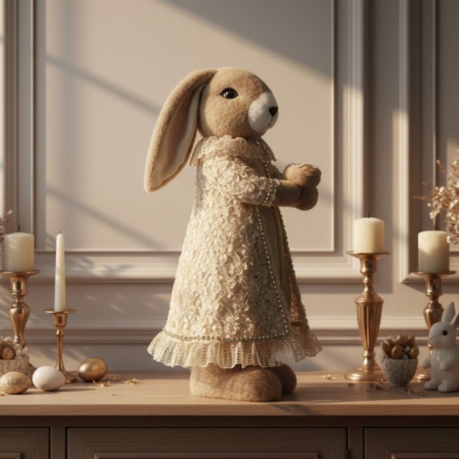 Coelho decorativo premium com roupa rendada bege e strass, elegante e detalhado, ideal para composições de Páscoa, no tamanho 48x17x22cm.