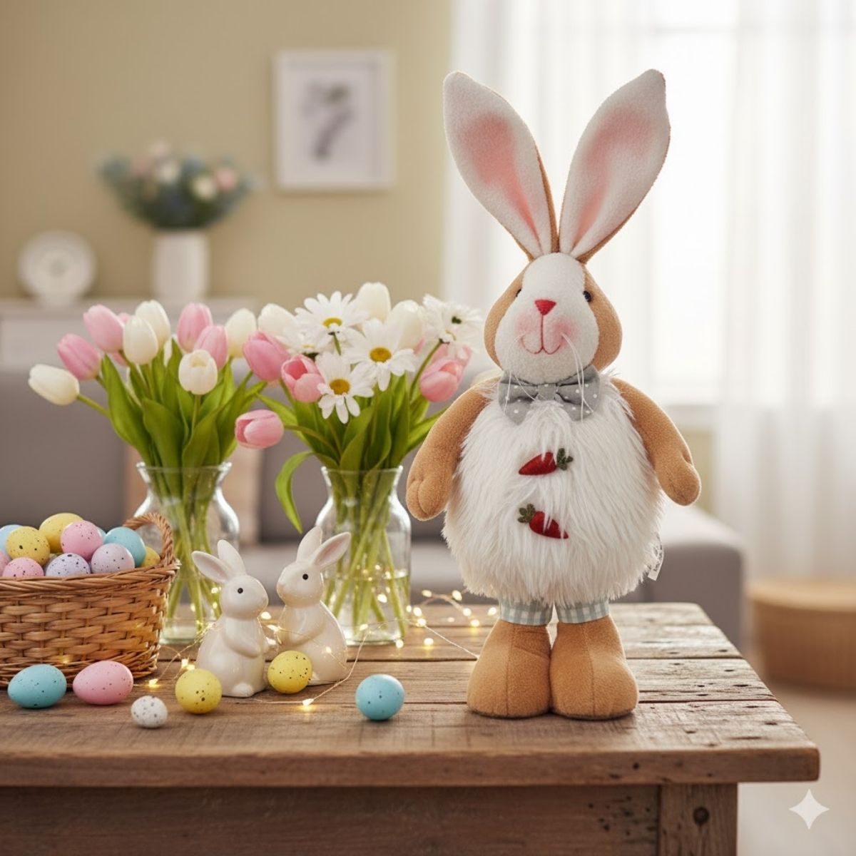 Ideal para decorar salas, aparadores, mesas ou cantinhos temáticos, esse coelho é perfeito para quem deseja composições de Páscoa com um toque artesanal e sofisticado. Seu estilo natural e elegante harmoniza facilmente com flores, cestinhas e outros enfeites da mesma linha.