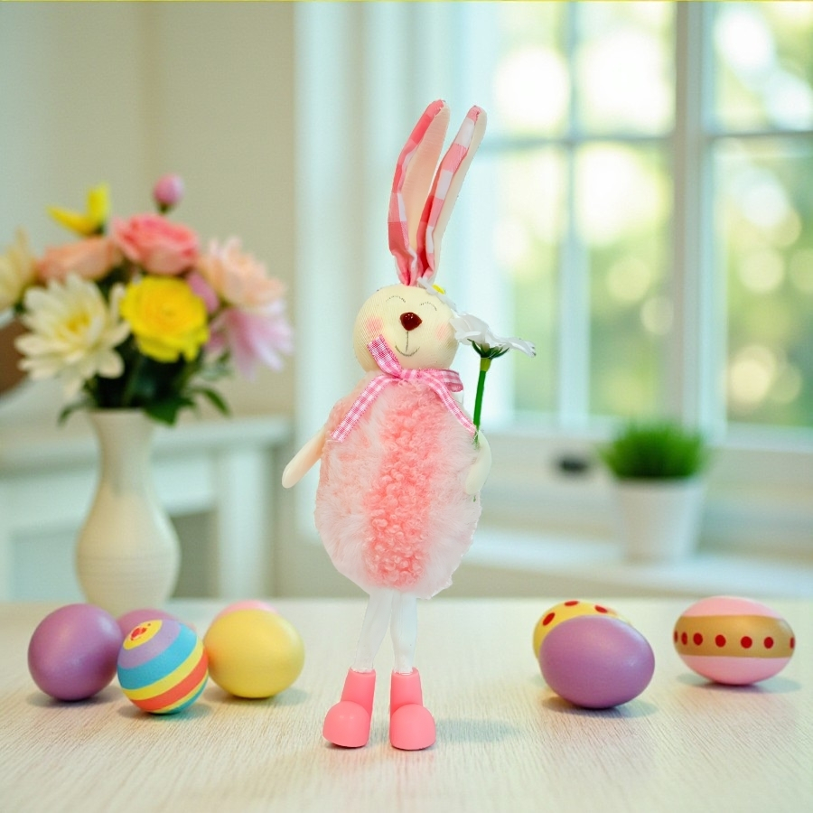 O Enfeite Decorativo Coelho Rosa com Flor mede 6x23x6cm, apresentando coelhinho em pé com acabamento detalhado e flor delicada. Fabricado com materiais leves e resistentes, é fácil de posicionar em diferentes superfícies, sendo uma peça prática e encantadora para a decoração de Páscoa.