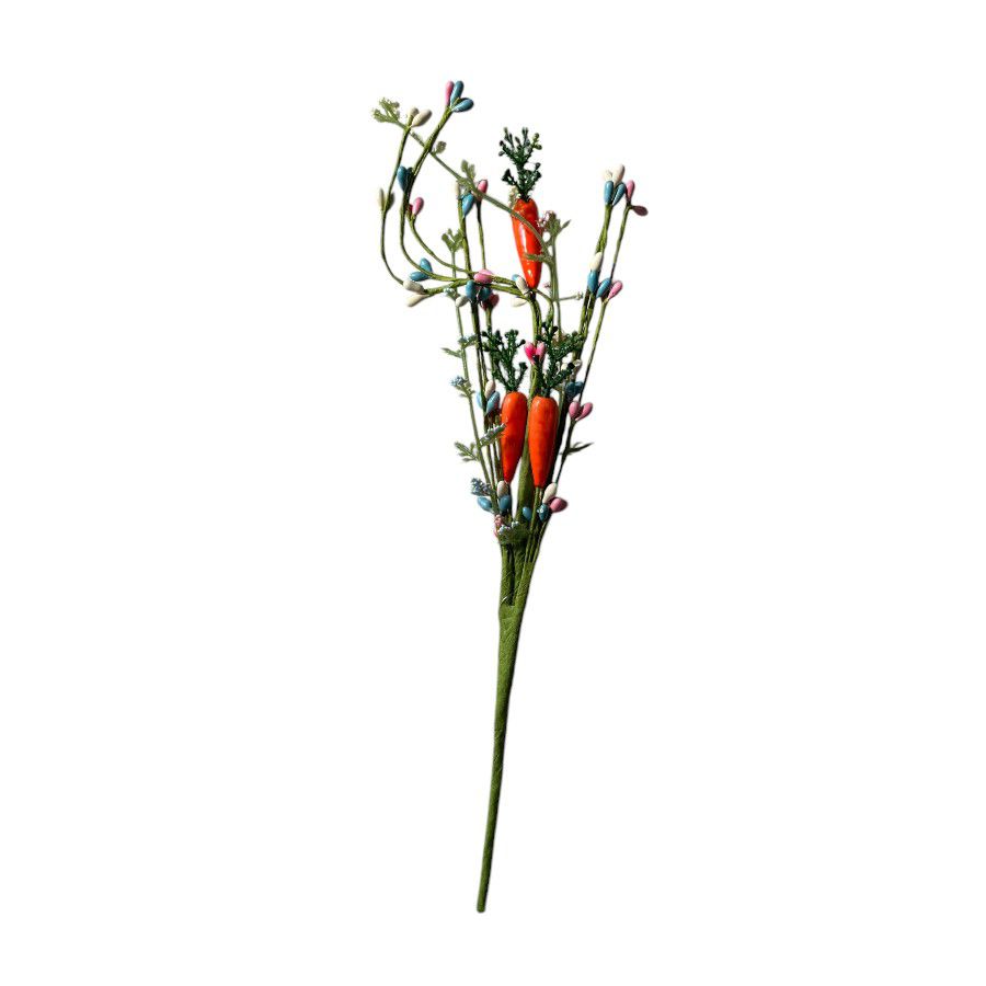 Enfeite decorativo de Páscoa em forma de galho com cenouras coloridas, medindo 37cm. Ideal para composições criativas e temáticas.