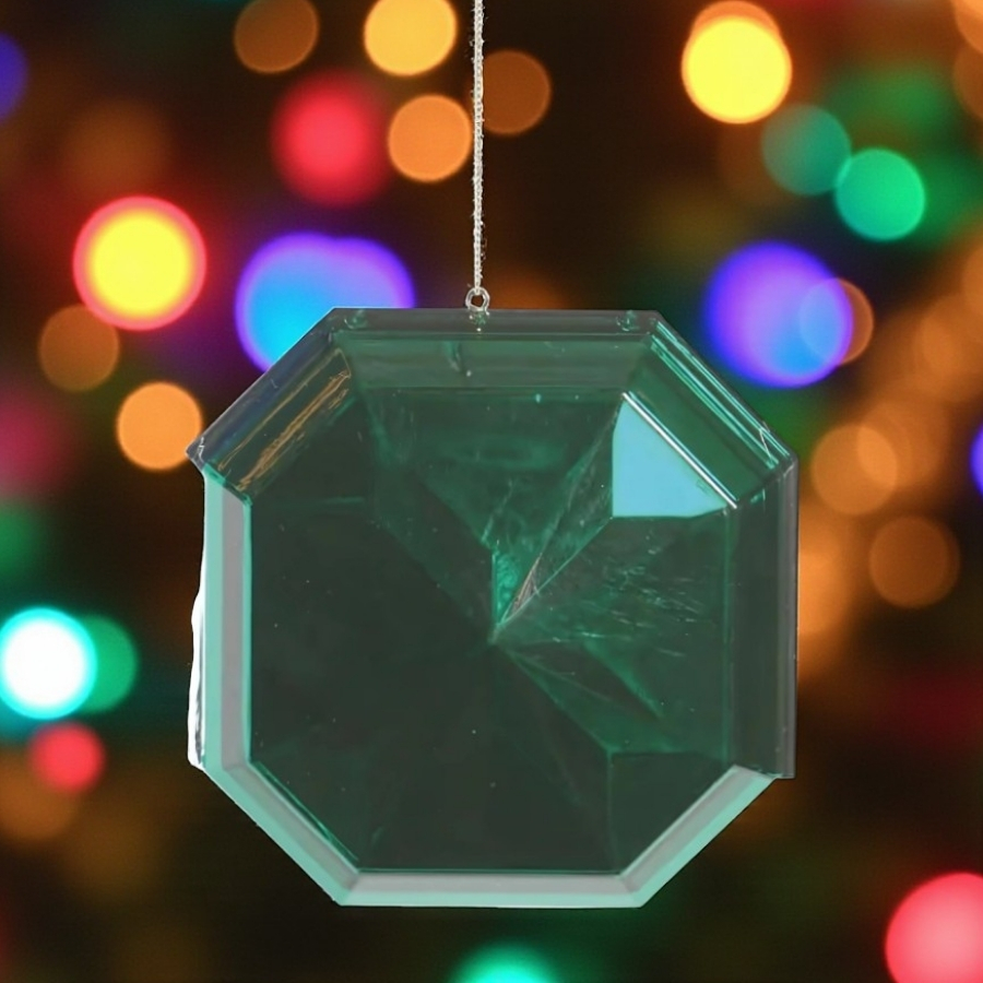 Enfeite para pendurar em árvore ou decoração de Natal, no formato de joia quadrada, com acabamento verde escuro. Mede 10x10x5,5cm, é leve, resistente e fácil de aplicar, ideal para criar efeitos sofisticados em ambientes internos.