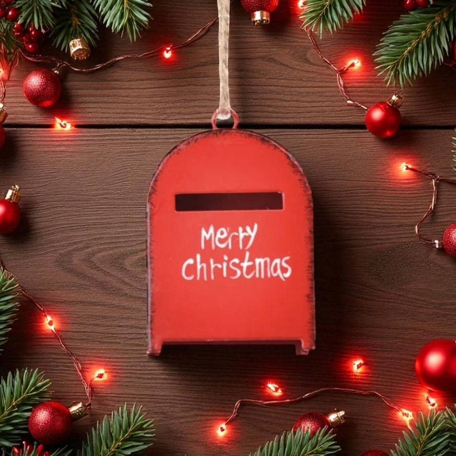 Enfeite para pendurar em formato de caixa de correio vermelha, 6cm, ideal para decoração natalina clássica e charmosa.