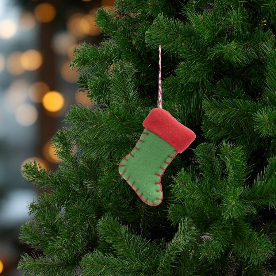 Enfeite de Natal em formato de meia, 10cm, em poliéster verde e vermelho. Ideal para árvores, guirlandas e arranjos festivos, adicionando tradição e cor à decoração natalina.