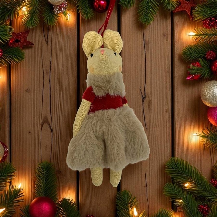 Enfeite para pendurar em formato de ratinha com vestido bege, 18cm, perfeito para decoração natalina elegante e acolhedora.