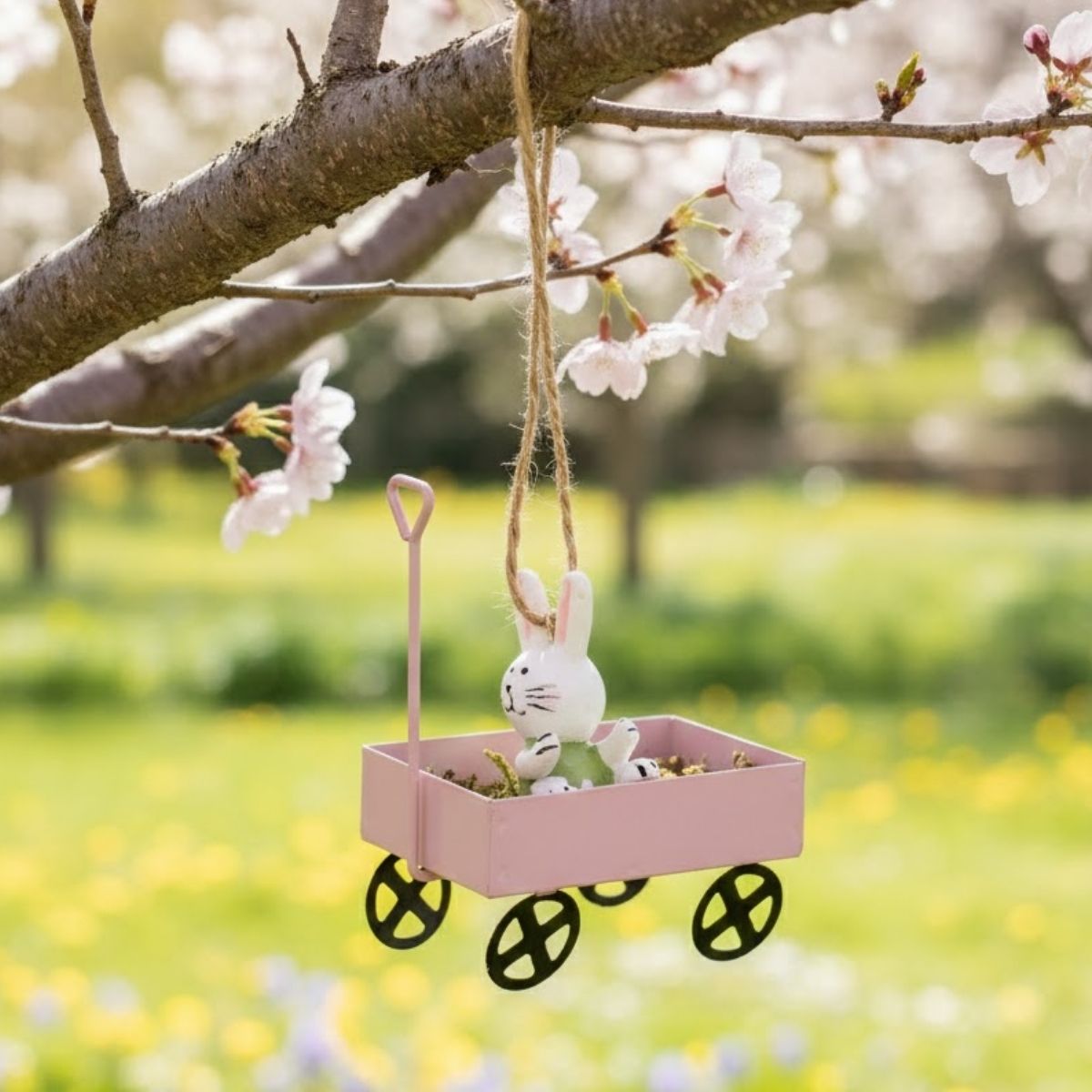 O Enfeite Decorativo de Páscoa para pendurar no formato de carrinho de mão é um item delicado e encantador para compor a decoração pascal. O carrinho rosa traz um coelhinho decorativo em seu interior, vestido com roupinha verde, criando um contraste suave e cheio de charme, perfeito para o clima da Páscoa.