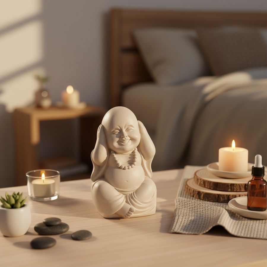 Produzida em cimento resistente e durável, a peça possui acabamento em bege ou tons terrosos, conferindo textura natural e aspecto rústico. Com medidas aproximadas de 11,5x6cm, o design detalhado e minimalista permite que a escultura seja usada em salas, quartos, escritórios ou ambientes zen, sozinha ou em conjunto com outros budas do trio "não ver, não ouvir, não falar o mal". É também uma excelente opção para presentear quem aprecia detalhes decorativos com significado e sofisticação.
