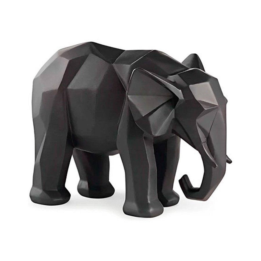 Escultura em poliresina no formato de elefante geométrico.