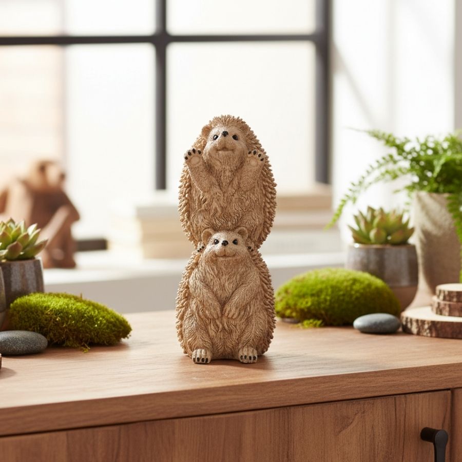 Escultura em poliresina representando dois ouriços empilhados, ideal para decorar ambientes com estilo, diversão e detalhes sofisticados no Home Decor.