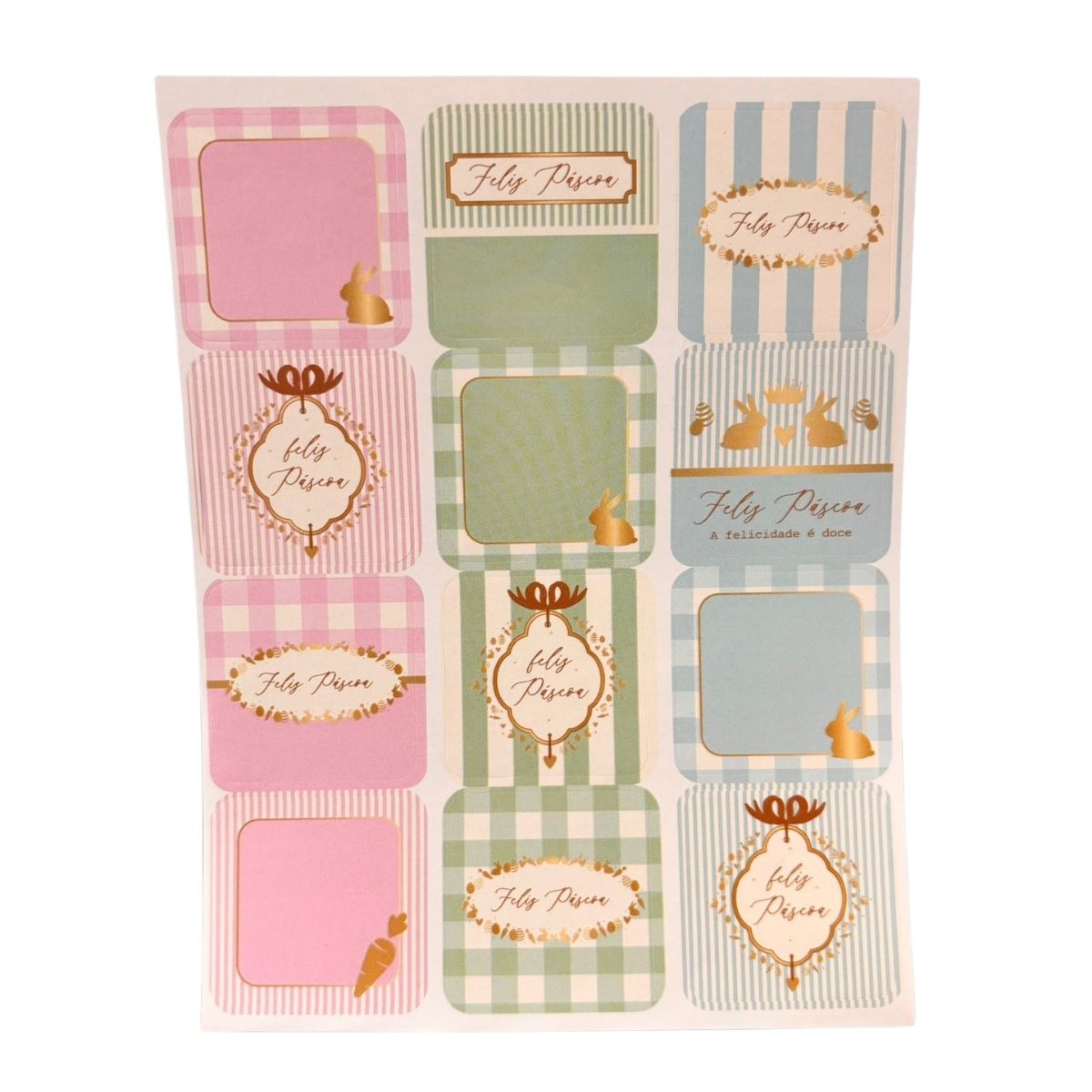As Etiquetas Adesivas - Quinn Compose - 4x4cm são perfeitas para decorar embalagens, lembrancinhas, presentes e projetos criativos durante a Páscoa. O kit inclui 2 cartelas, totalizando 24 adesivos, sendo 8 unidades de cada cor: lilás pastel, verde pastel e azul pastel. As etiquetas trazem uma variedade de estampas encantadoras — listras, “Feliz Páscoa”, cenouras, ovos e detalhes em branco e dourado — criando combinações delicadas, modernas e perfeitas para personalizar qualquer item com charme.