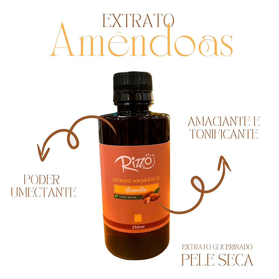 Extrato aromático de amêndoa para utilizar em cremes, body splash, bases, sabonete para banho, shampoo e condicionador. Modo de Uso: Aplicar o extrato no produto desejado. (Guardar em local fresco ou seco, ao abrigo da luz. Evite contato com os olhos, boca e mucosas. Em caso de contato com os olhos lave com água abundantemente. Mantenha fora do alcance de crianças. Em caso de irritação suspenda o uso. Uso externo)