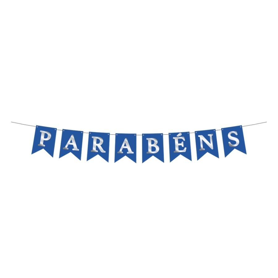 Esta Faixa Decorativa no formato de Bandeirola é a escolha ideal para comemorar qualquer tipo de conquista ou celebração. A combinação das cores Azul e Prata cria um visual alegre e, ao mesmo tempo, elegante e moderno. O design em bandeirolas confere um charme festivo e dinâmico, garantindo que o local da festa se destaque. Com a mensagem universal "Parabéns", a faixa é versátil e perfeita para formaturas, promoções, batizados ou chás de bebê.