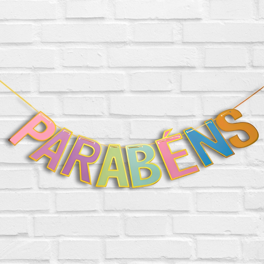 Faixa decorativa "Parabéns" com design colorido, com 2 metros de comprimento. Letras grandes, visíveis e um toque alegre para qualquer comemoração. Fácil aplicação e versátil para diferentes tipos de decoração.