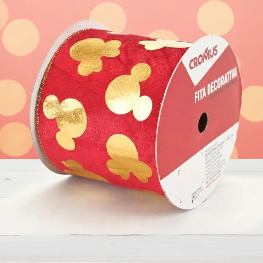 A Fita Decorativa Aramada Mickey Mouse Disney traz um toque sofisticado para as composições temáticas, combinando textura camurçada em tom vermelho intenso com silhuetas do Mickey e da Minnie aplicadas em dourado hotstamping. Com 10 cm de largura e 457 cm de comprimento, possui bordas aramadas, garantindo firmeza para criar laços estruturados, arremates elegantes e detalhes decorativos cheios de encanto.