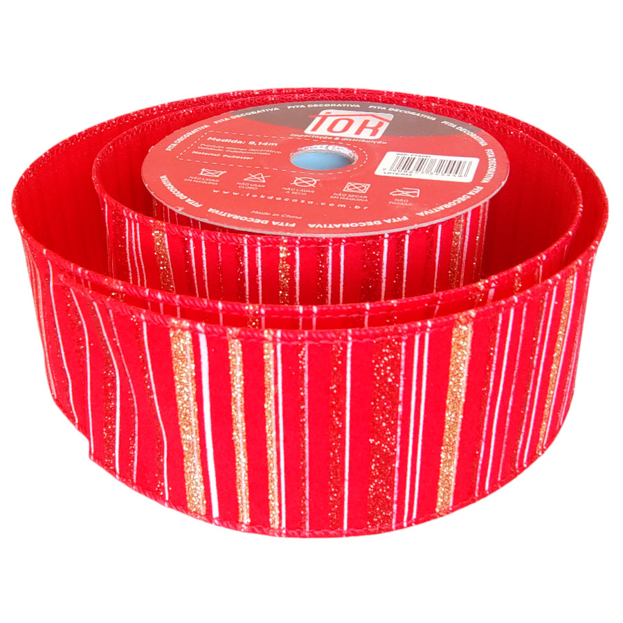 Fita decorativa vermelha, com listras glitter vermelho e dourado