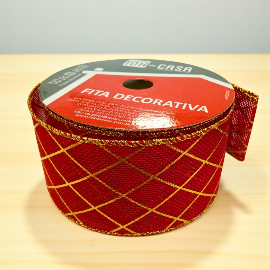 Fita decorativa em tecido vermelho com traços dourados, medindo 6,3cm de largura e 914cm de comprimento. Ideal para artesanato, decoração natalina, laços e embalagens personalizadas.
