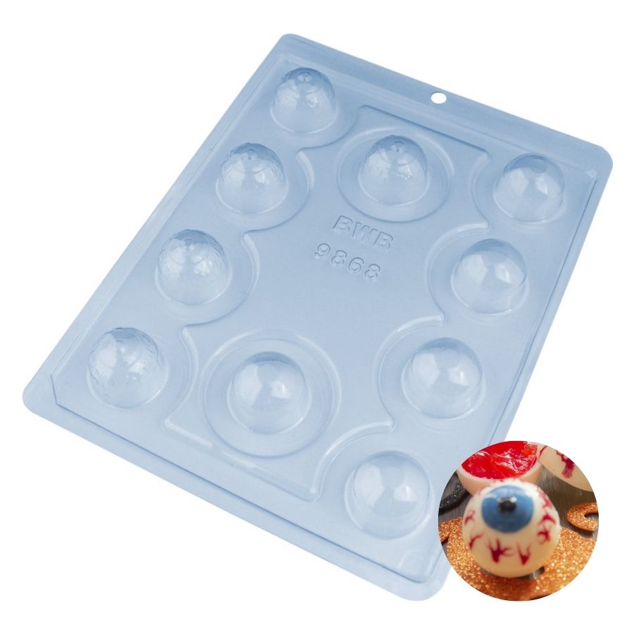A Forma Especial de Acetato Globo Ocular 3 Partes, que são duas rígidas e uma flexível, é ideal para confeiteiros que buscam criar chocolates ocos com um toque divertido e temático. Fabricada em acetato resistente com encaixe de silicone, possui 10 cavidades de aproximadamente 3x3cm cada, moldando chocolates no formato de globos oculares, perfeitos para festas de Halloween e lembrancinhas criativas.