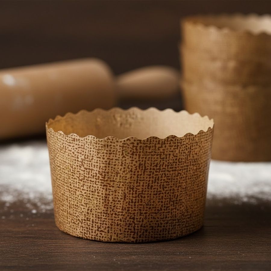 Forma para panetone 100g em papel italiano forneável, microperfurada, antiaderente e à prova de gordura. Ideal para assar e apresentar panetones uniformes e elegantes.