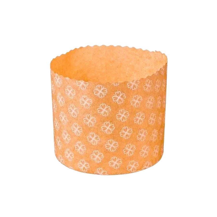 Forma para panetone de 250g em kraft decorado com trevos, resistente ao forno e microporosa, garantindo assamento uniforme. Ideal para presentes e produções artesanais.