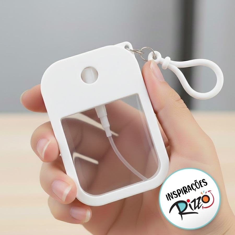 Este item é um recipiente pulverizador em formato plano de cartão com capacidade de 50ml. O frasco interno conta com um sistema spray que dispensa o líquido em névoa fina. O diferencial é a capa protetora de silicone na cor Branco, que garante a integridade e um toque agradável. Graças ao gancho acoplado, ele pode ser usado como um chaveiro spray, permitindo o transporte externo e seguro. Sendo totalmente recarregável, é uma alternativa sustentável e prática para levar álcool líquido e outros cosméticos.