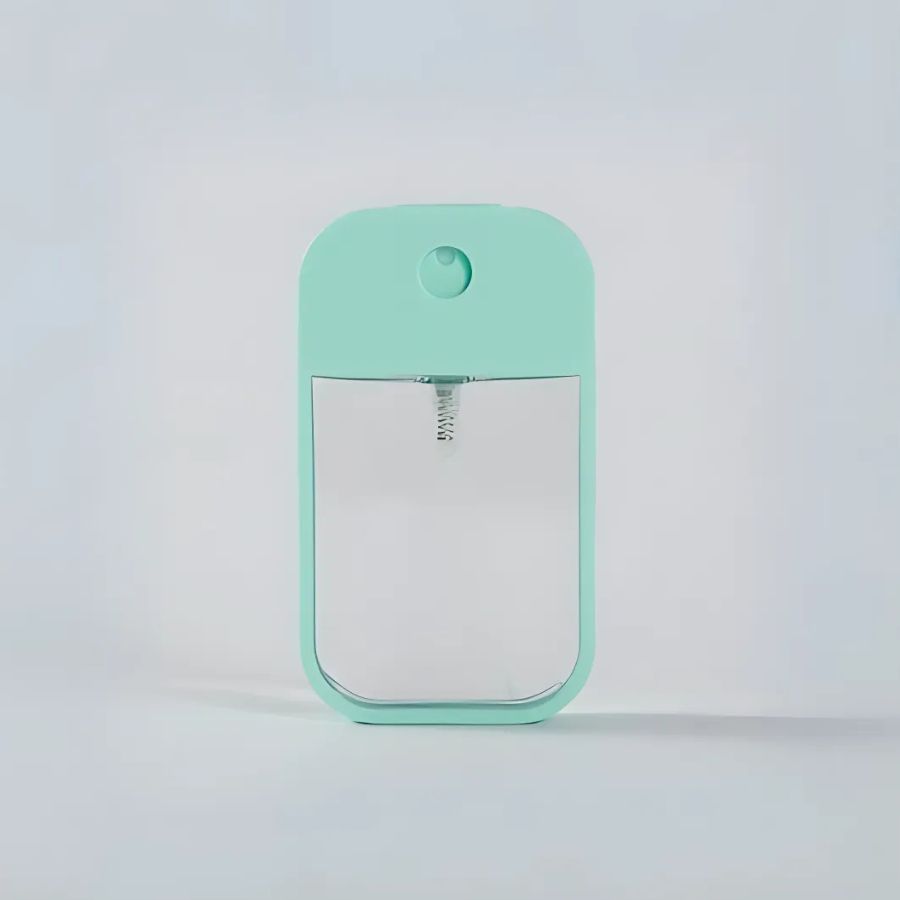 Frasco portátil de 45ml com válvula spray fina, ideal para perfumes, essências ou álcool. Recarregável, leve e disponível em várias cores.