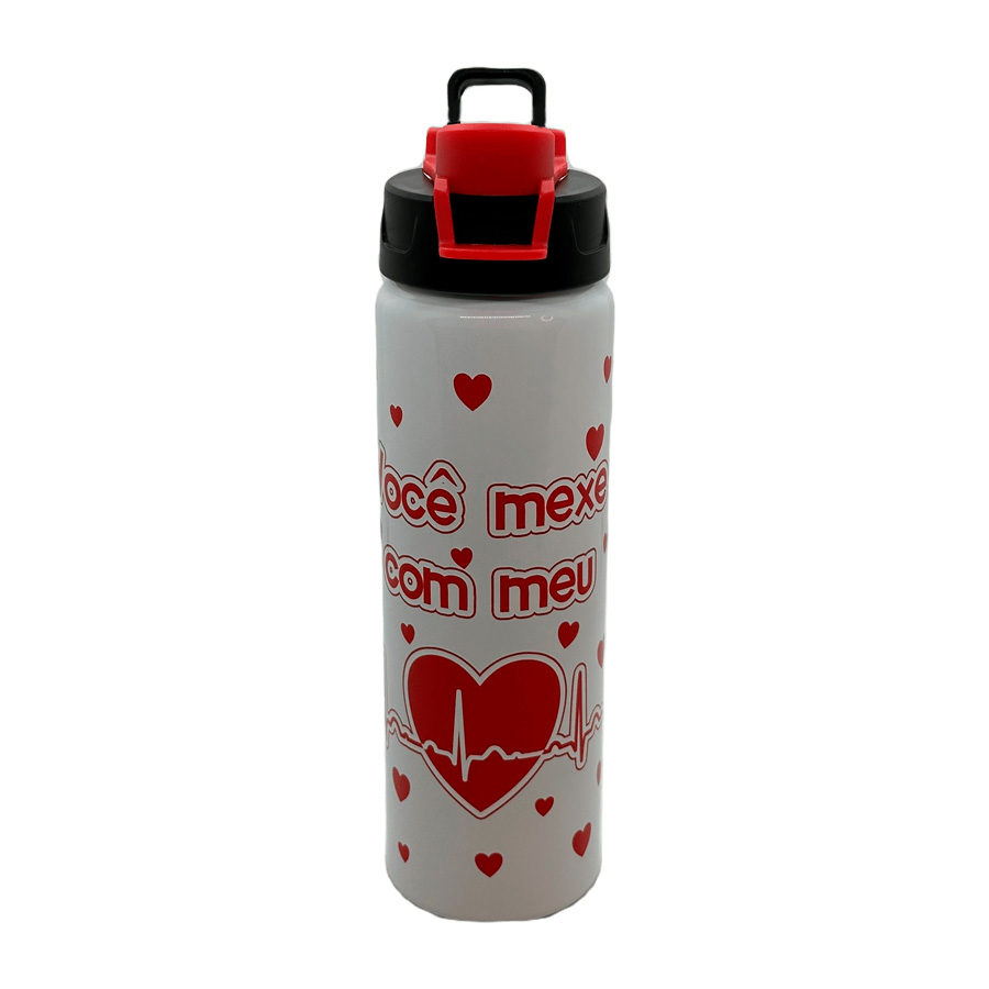 Garrafa 600ml de aluminío estampada com fundo branco, salpicado com corações vermelhos destacando a mensagem em vermelho "Você mexe com o meu (coração com simbolo de monitor cardíaco)