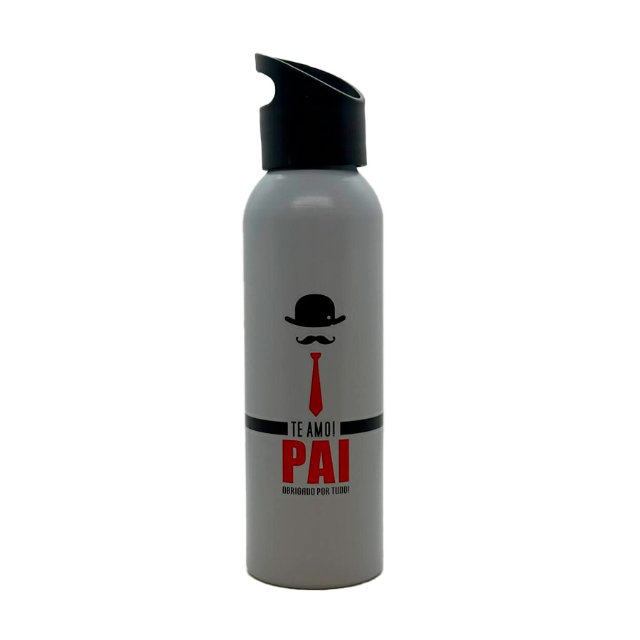 Garrafa de Alumínio com alça na tampa, estampada com fundo cinza com 1 faixa preta contornando, destacando um chapéu derby, bigode francês e gravata longa vermelha, com a mensagem abaixo "Te amo! Pai, Obrigado por Tudo"