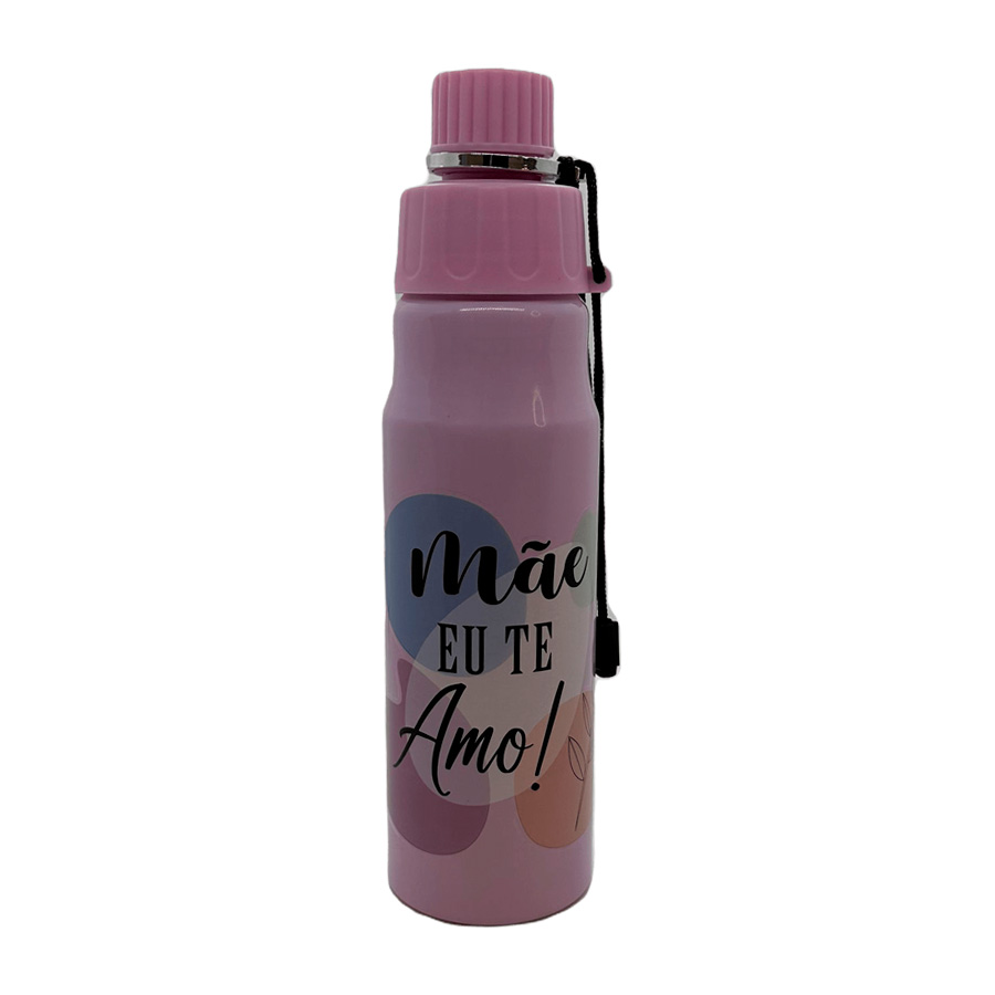 Garrafa 600ml de aluminio estampada com a mensagem "Mãe eu te amo!", com a cor roxo solida de fundo