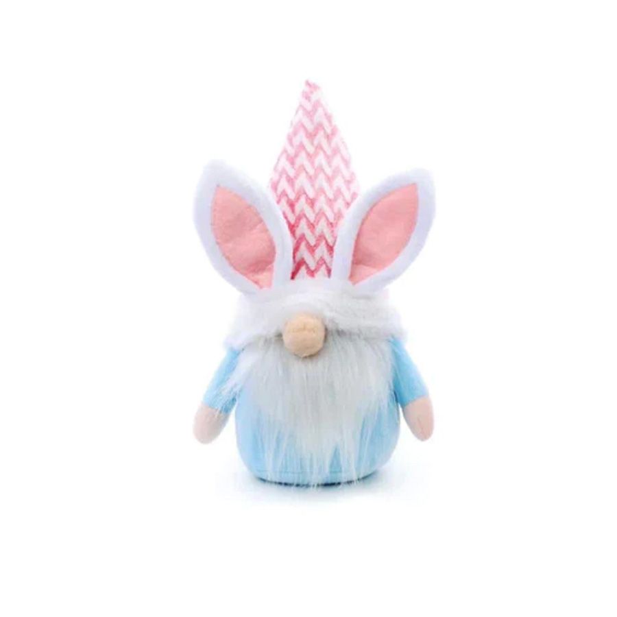 Gnomo Kringle com Orelha Coelho, com roupa azul e gorro listrado rosa e branco