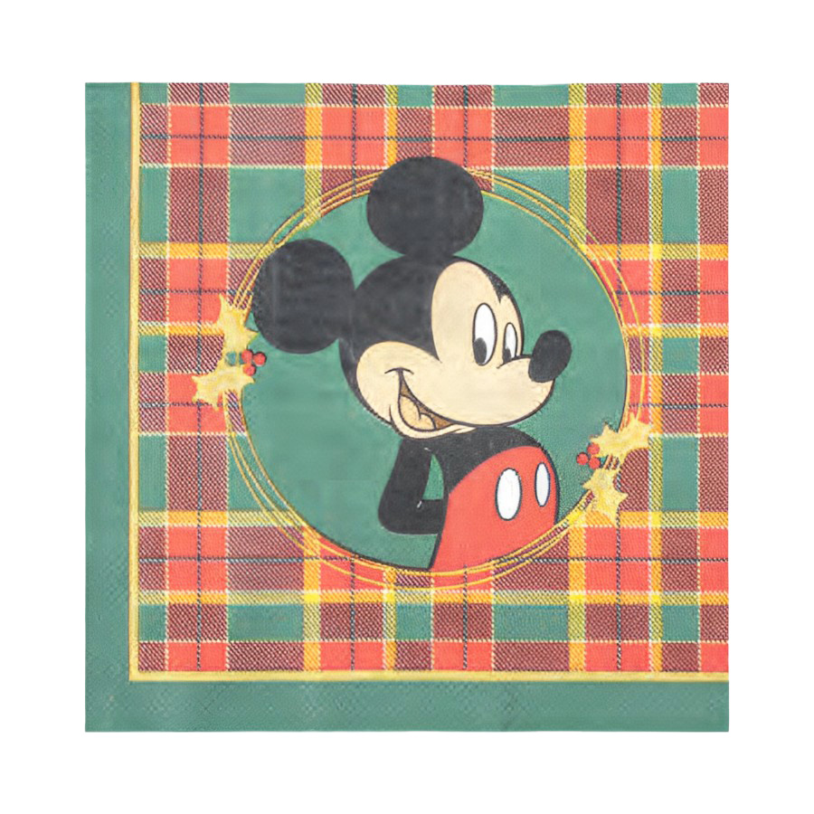 Guardanapo de papel com design xadrez natalino nas cores verde e vermelho, com temática do Mickey. O personagem icônico é destacado ao centro, trazendo um toque festivo e alegre.