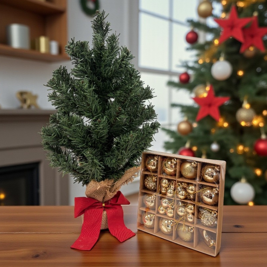 Este kit inclui um pinheiro decorativo com base e laço de 45 cm, acompanhado por uma estrela de Natal de 4,5 cm para o topo. Para completar, são 24 bolinhas de 2 cm e 11 bolinhas de 4 cm, todas na elegante cor ouro, garantindo uma decoração sofisticada e harmoniosa. Ideal para criar um cenário natalino encantador em qualquer ambiente.