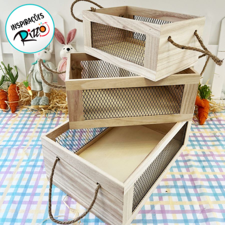 Kit com 3 caixotes de madeira com tela nas laterais e alça. Ideais para organização e decoração com um toque rústico e elegante.