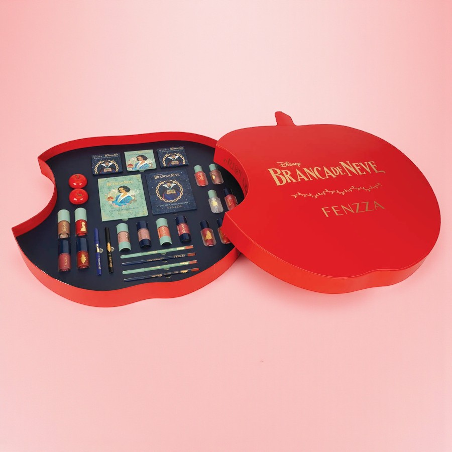 O Kit de Maquiagem Branca de Neve Disney da Fenzza traz uma coleção completa e inspirada no universo mágico da Princesa e da Rainha Má. Composto por paletas de sombras, blushes líquidos, batons, canetas delineadoras, contornos labiais, gloss oil e iluminadores, além do exclusivo blush mágico, o kit oferece diversidade de cores e acabamentos para criar makes encantadoras. A embalagem em formato de maçã adiciona um charme especial e temático.