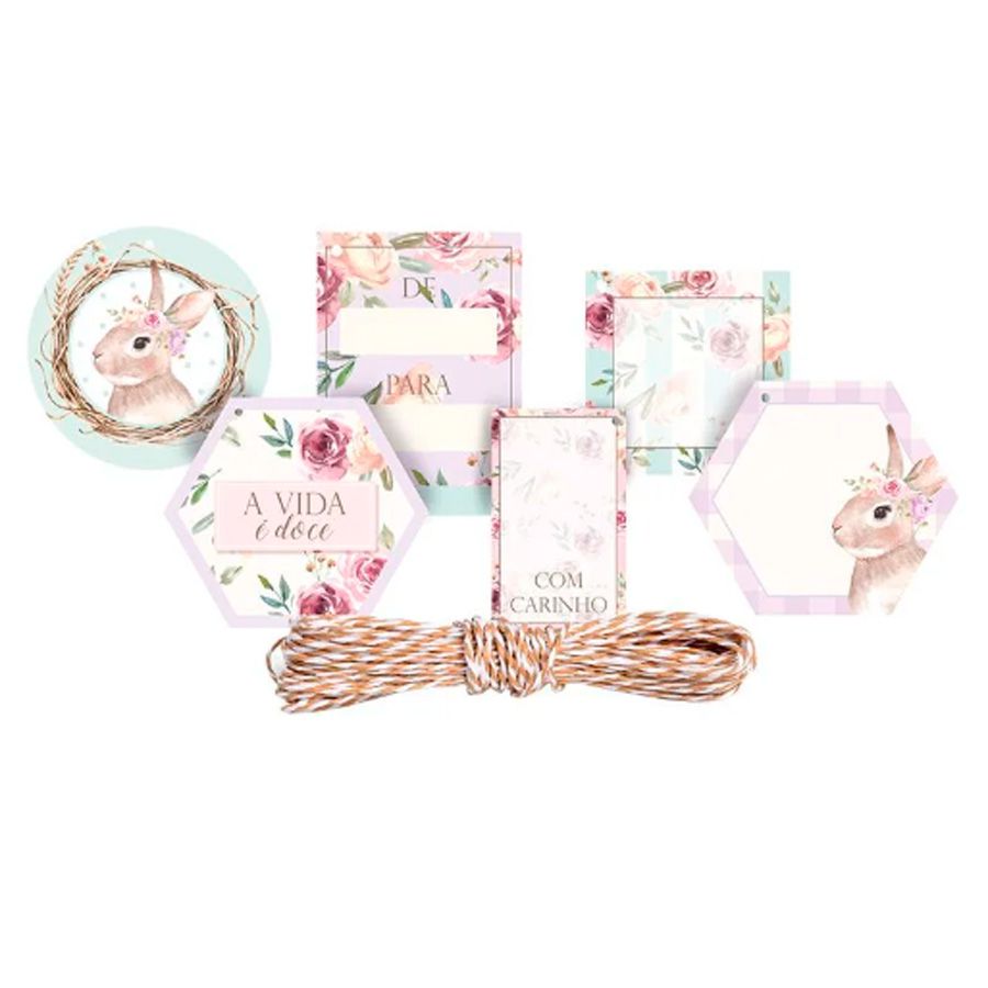 13 tags de variaveis formatos e estampas diferentes, com varias mensagens positivas e imagens de coelhos e todos com um furo para pendurar, acompanhado de um cordão de papel kraft medindo 13 metros