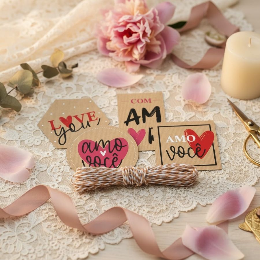 Kit de fechamento para presentes com 13 tags e 13m de cordão no tema romântico, ideal para decorar embalagens com charme e elegância.