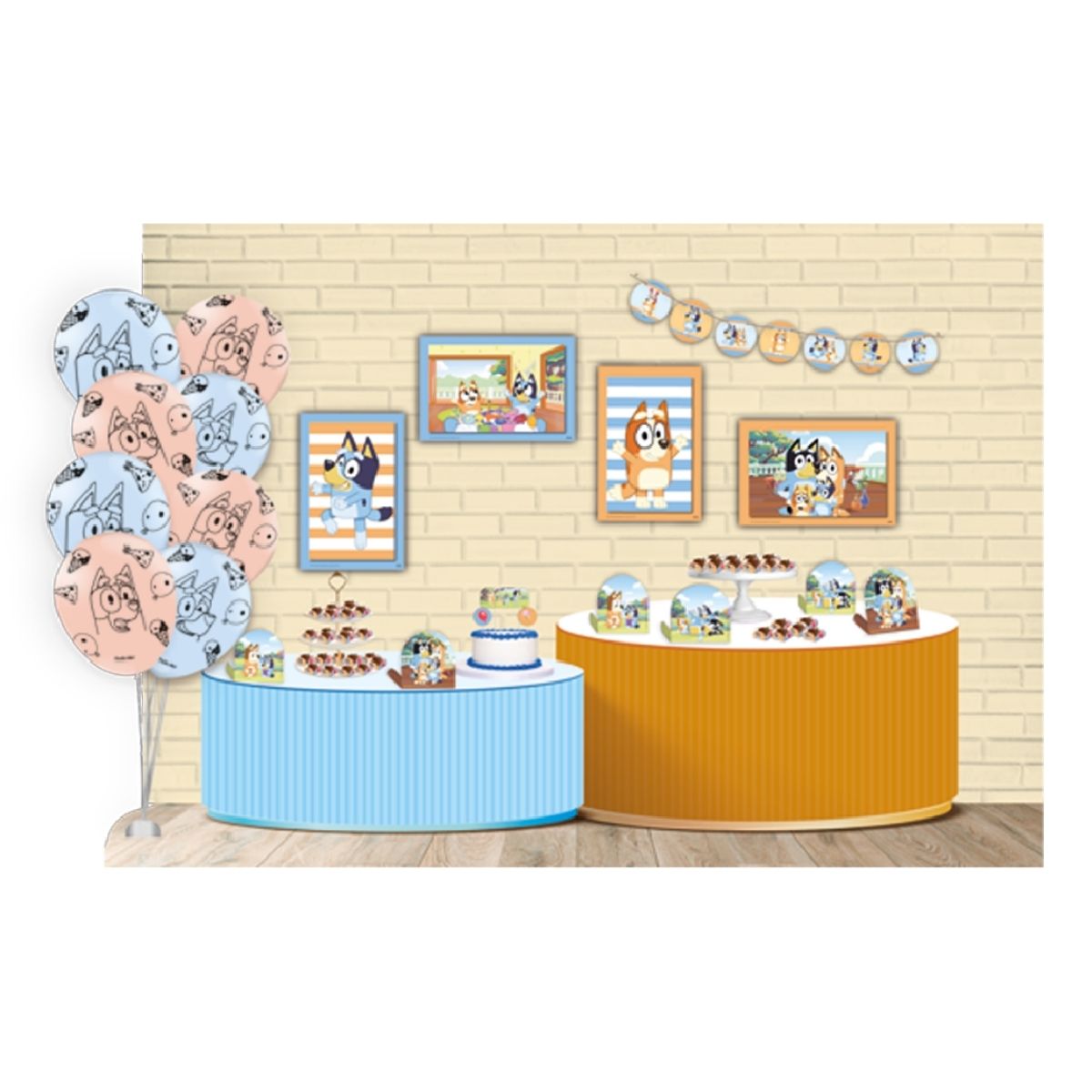 Use os quadros próximos à mesa principal, distribua as decorações de mesa ao redor dos doces, posicione os topos no bolo ou em displays e finalize com a faixa decorativa no fundo. Os balões podem ser usados em arranjos simples ou combinados com outros elementos da festa.