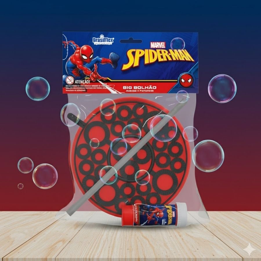 O Kit Lembrancinha Big Bolhão – Homem Aranha é perfeito para levar ação e diversão às festas temáticas do herói mais querido da Marvel. O conjunto inclui um refil de líquido para bolha de 60ml e um aplicador grande com vários círculos de diferentes tamanhos, criando múltiplas bolhas ao mesmo tempo e garantindo um efeito visual incrível. Ideal para festas Homem Aranha, festa heróis e comemorações cheias de energia.