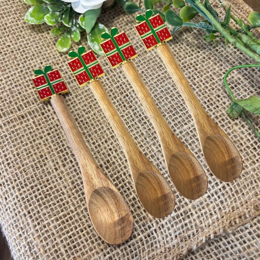 O Kit Mini Colher de Madeira - Presentinho - 13cm é um conjunto encantador de quatro colherzinhas, perfeito para lembrancinhas ou detalhes de decoração em festas e eventos. Cada colher possui um aplique de metal no topo, representando um presentinho de Natal nas cores vermelho e verde, trazendo charme e delicadeza à sua mesa ou kit de presentes.