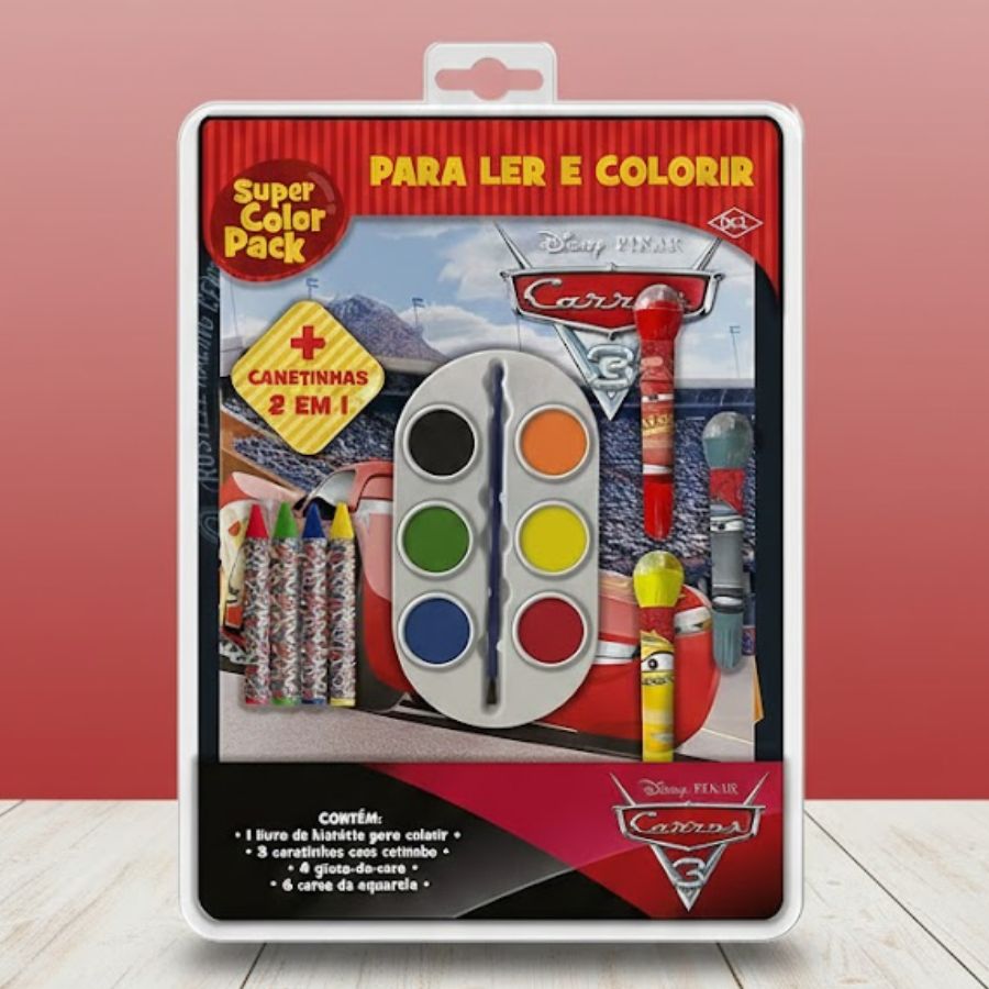 O Kit Para Ler e Colorir Aquarela inspirado em Carros Disney apresenta 14 itens desenvolvidos para estimular leitura, criatividade e expressão artística em crianças a partir de 3 anos. Ele inclui 1 livro de histórias para colorir com 8 páginas, 3 canetinhas 2 em 1 (com ponta para colorir e carimbo na outra extremidade), 4 giz de cera e 6 cores de aquarela acompanhadas de pincel, formando um conjunto completo para atividades divertidas. Sonhe, realize e comemore com um item temático disponível na Loja Rizzo e com Produto Licenciado Disney.