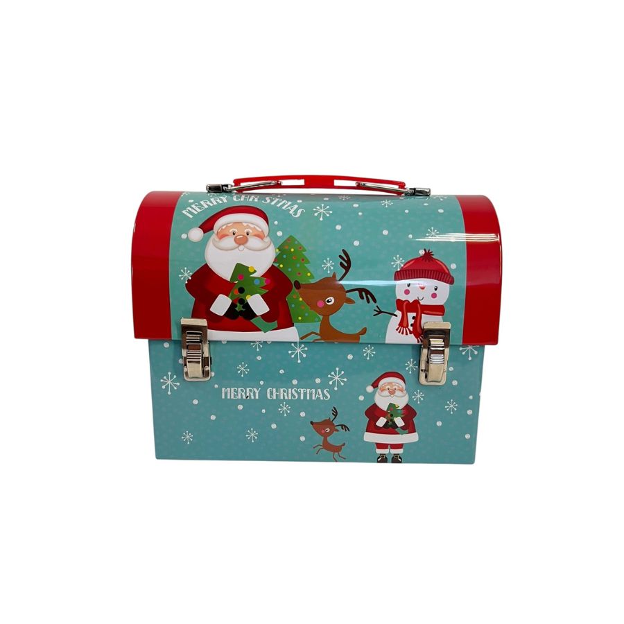A Lata de Metal de Natal Decorativa 17x13x8cm "Merry Christmas" Papai Noel, Rena e Boneco de Neve Verde é resistente, prática e estilosa, ideal para presentear ou decorar durante o Natal.