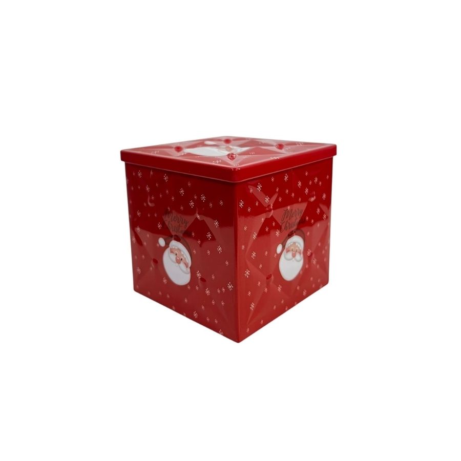 A Lata de Metal de Natal Decorativa 9x9x9cm "Merry Christmas" Papai Noel Vermelha é resistente, prática e estilosa, ideal para presentear ou decorar durante o Natal.