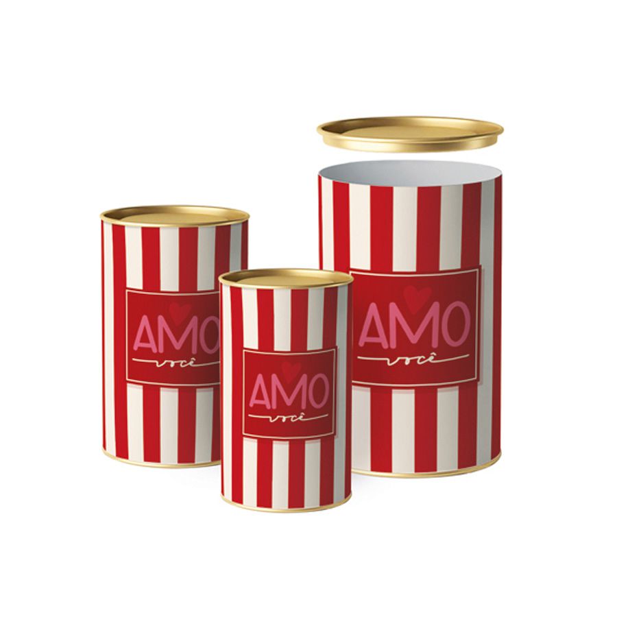 Lata redonda de papel cartão e metal, ideal para guardar ovos da páscoa, estampada por listras verticais por toda a lata destacando um quadrado vermelho com a mensagem "Amo Você" com um coração acima da frase