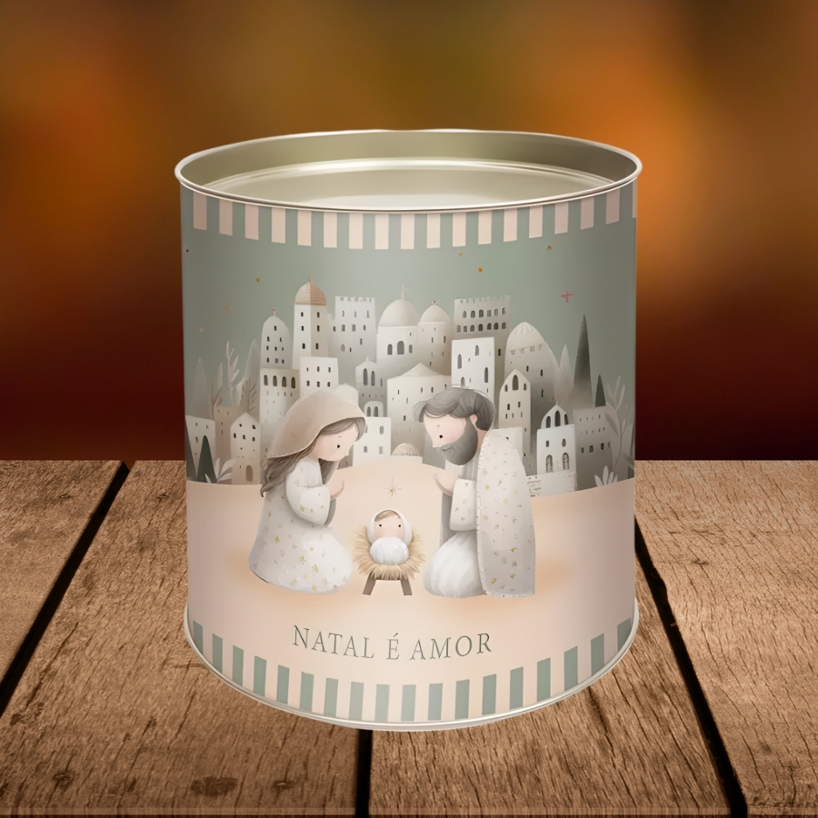 Lata rígida temática “Belém Cenário”, indicada para panetones de 100g. Pode ser utilizada para presentear, decorar ou armazenar pequenos itens, oferecendo resistência e apresentação refinada.