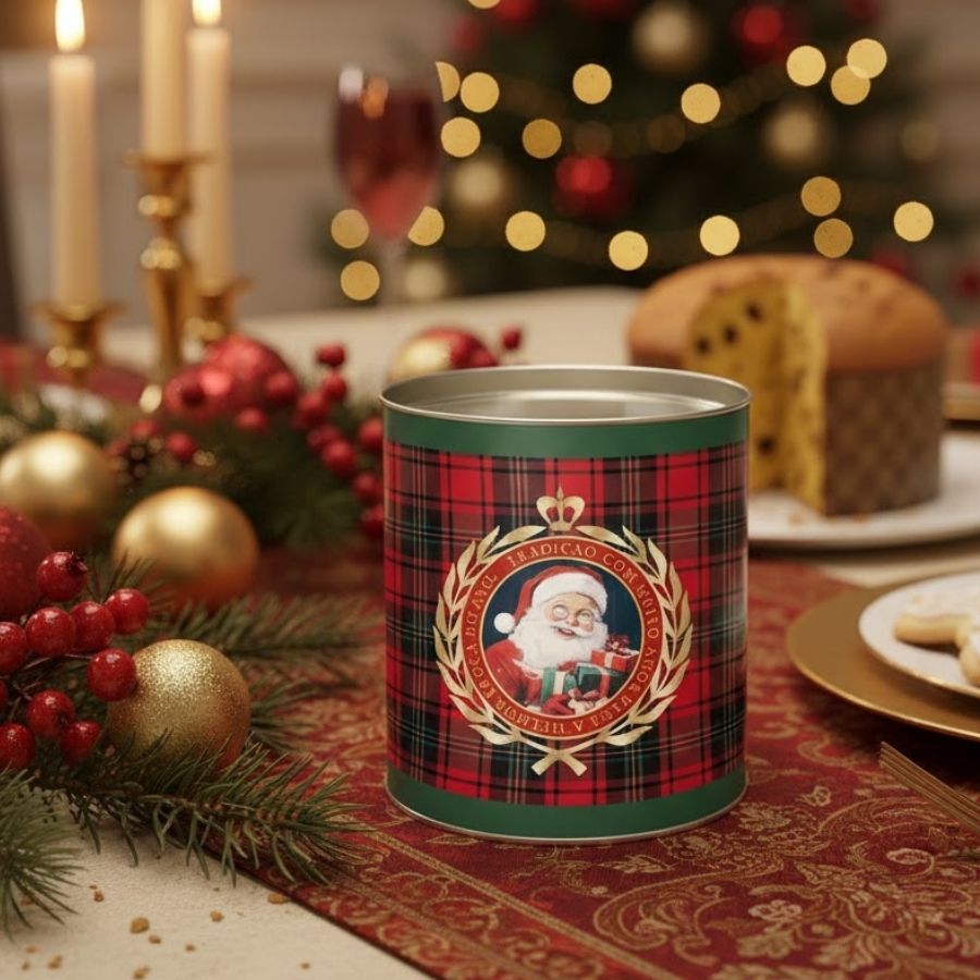 Ideal para presentes, lembranças corporativas ou vendas artesanais, essa lata decorativa protege e valoriza o produto, mantendo a aparência e o sabor do panetone por mais tempo. Além de funcional, é um item colecionável e reutilizável, podendo ser usado como decoração natalina ou organizador criativo após o uso. Uma opção prática, elegante e sustentável para o fim de ano.