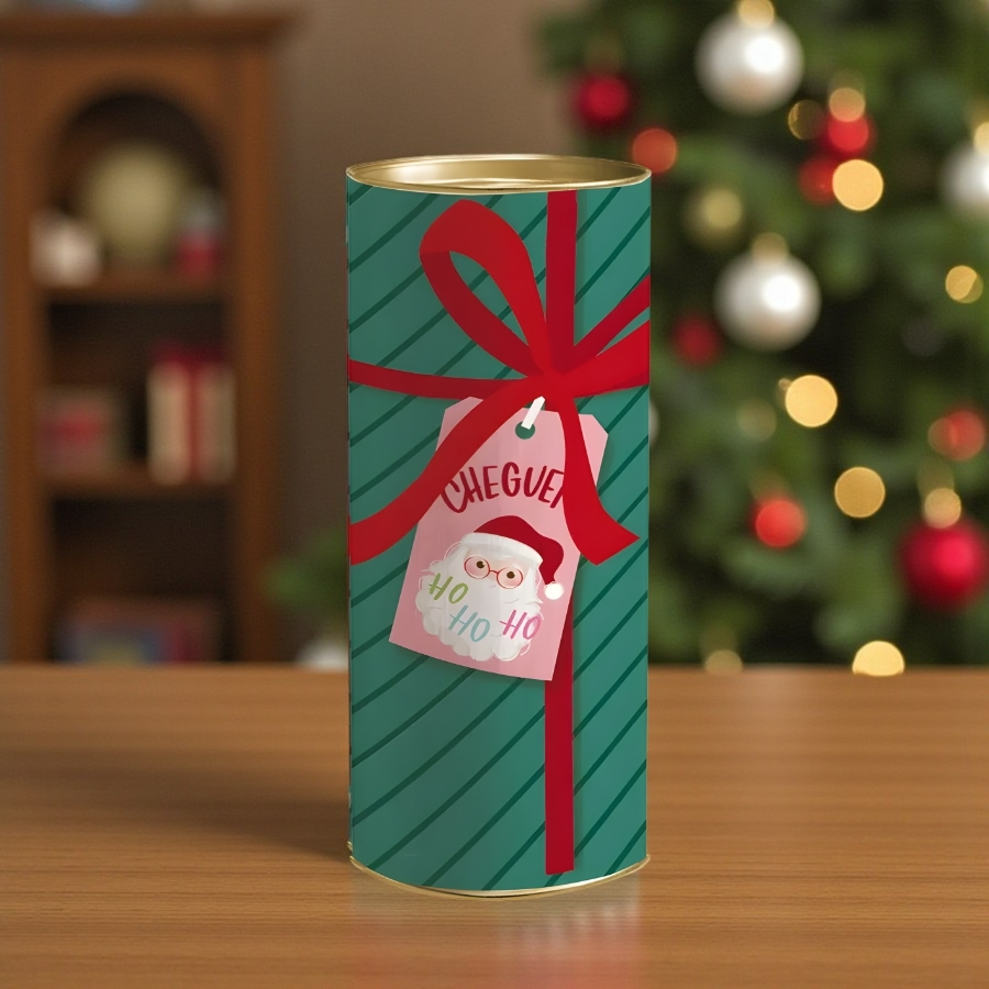 Lata rígida decorativa com estampa Presentes Verde, desenvolvida especialmente para presentes de Natal. Fabricada em material resistente, combina praticidade, durabilidade e um visual festivo, sendo perfeita para embalar panetones, biscoitos e lembranças em geral.