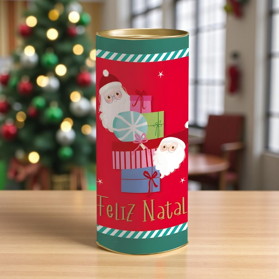 Com dimensões de 10x27x10cm, essa lata rígida é resistente e reutilizável, ideal para compor kits de Natal ou presentear de forma sofisticada. Combina praticidade e charme, valorizando a apresentação de qualquer presente ou lembrancinha.