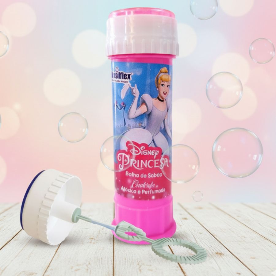 A Lembrancinha Bolha de Sabão Cinderela 60ml traz o encanto das histórias clássicas para celebrações cheias de magia. Com visual delicado inspirado na Cinderela Disney, o frasco possui tampa com mini labirinto, tornando o brinde ainda mais divertido para as crianças. A fórmula é atóxica e perfumada, indicada para maiores de 3 anos e perfeita para festa princesas e lembrancinha menina, convidando todos a sonhar, realizar e comemorar com ternura. Produto Licenciado Disney.
