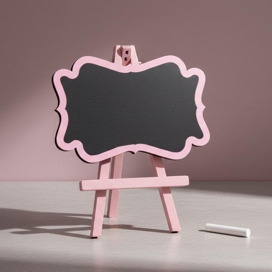 Lousa decorativa em MDF com acabamento em arabesco na cor rosa claro, ideal para mensagens, sinalização e identificação com visual delicado e elegante. Possui medidas aproximadas de 24x20cm, perfeita para festas e ambientes decorativos.