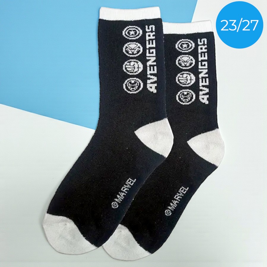 A Meia Infantil Cano Médio Vingadores traz um visual moderno em preto com detalhes em cinza claro, perfeita para quem adora o universo dos heróis Marvel Disney. Confortável e estilosa, acompanha a rotina dos pequenos em passeios, escola e momentos de diversão com um toque temático especial.